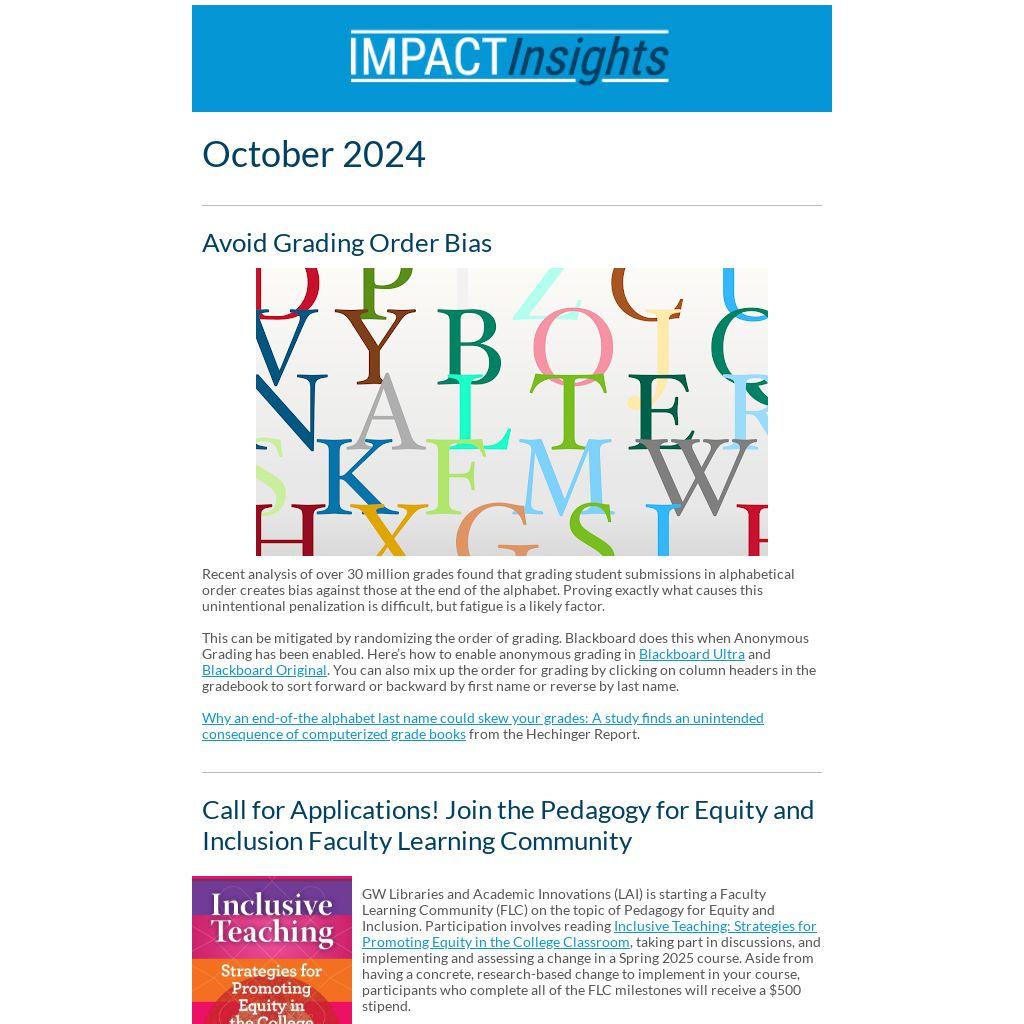 GW Libraries and Academic Innovations (LAI) is starting a Faculty Learning Community (FLC) on the topic of Pedagogy for Equity and Inclusion. Participation involves reading Inclusive Teaching: Strategies for Promoting Equity in the College Classroom, taking part in discussions, and implementing and assessing a change in a Spring 2025 course. Aside from having a concrete, research-based change to implement in your course, participants who complete all of the FLC milestones will receive a $500 stipend.