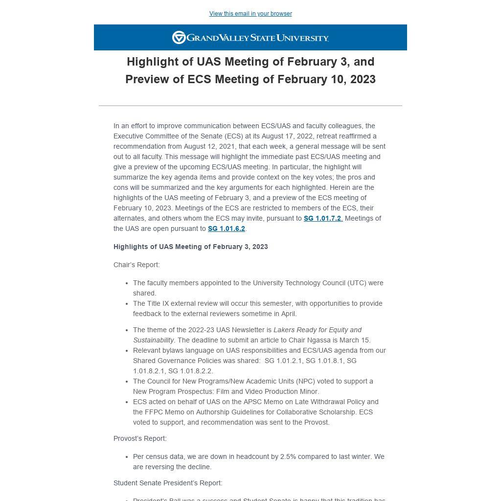 In an effort to improve communication between ECS/UAS and faculty colleagues, the Executive Committee of the Senate (ECS) at its August 17, 2022, retreat reaffirmed a recommendation from August 12, 2021, that each week, a general message will be sent out to all faculty. This message will highlight the immediate past ECS/UAS meeting and give a preview of the upcoming ECS/UAS meeting. In particular, the highlight will summarize the key agenda items and provide context on the key votes; the pros and cons will be summarized and the key arguments for each highlighted. Herein are the highlights of the UAS meeting of February 3, and a preview of the ECS meeting of February 10, 2023. Meetings of the ECS are restricted to members of the ECS, their alternates, and others whom the ECS may invite, pursuant to SG 1.01.7.2. Meetings of the UAS are open pursuant to SG 1.01.6.2.