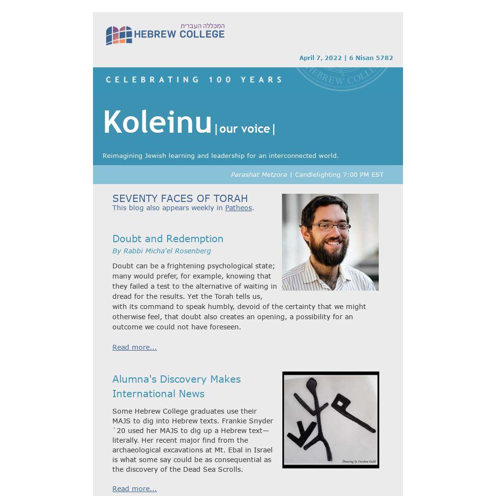 SAVE THE DATE Hebrew College Centennial Celebration Remember. Renew. Reimagine. Hybrid event on June 2 In person at Temple Beth Elohim, Wellesley, 6:30-8:30 p.m. or virtually 7:30-8:30 p.m. Learn more | Watch for more information soon