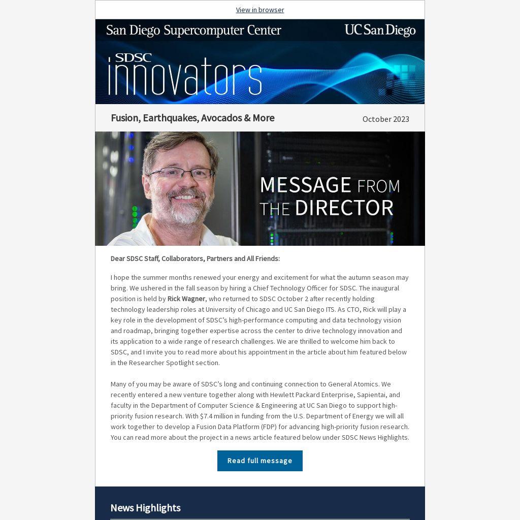 Many of you may be aware of SDSC’s long and continuing connection to General Atomics. We recently entered a new venture together along with Hewlett Packard Enterprise, Sapientai, and faculty in the Department of Computer Science & Engineering at UC San Diego to support high-priority fusion research. With $7.4 million in funding from the U.S. Department of Energy we will all work together to develop a Fusion Data Platform (FDP) for advancing high-priority fusion research. You can read more about the project in a news article featured below under SDSC News Highlights.