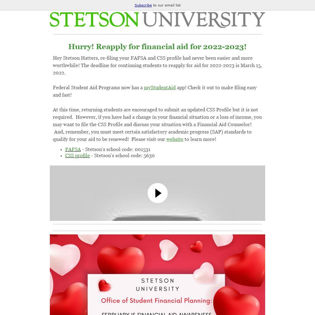 Hey Stetson Hatters, re-filing your FAFSA and CSS profile had never been easier and more worthwhile! The deadline for continuing students to reapply for aid for 2022-2023 is March 15, 2022.