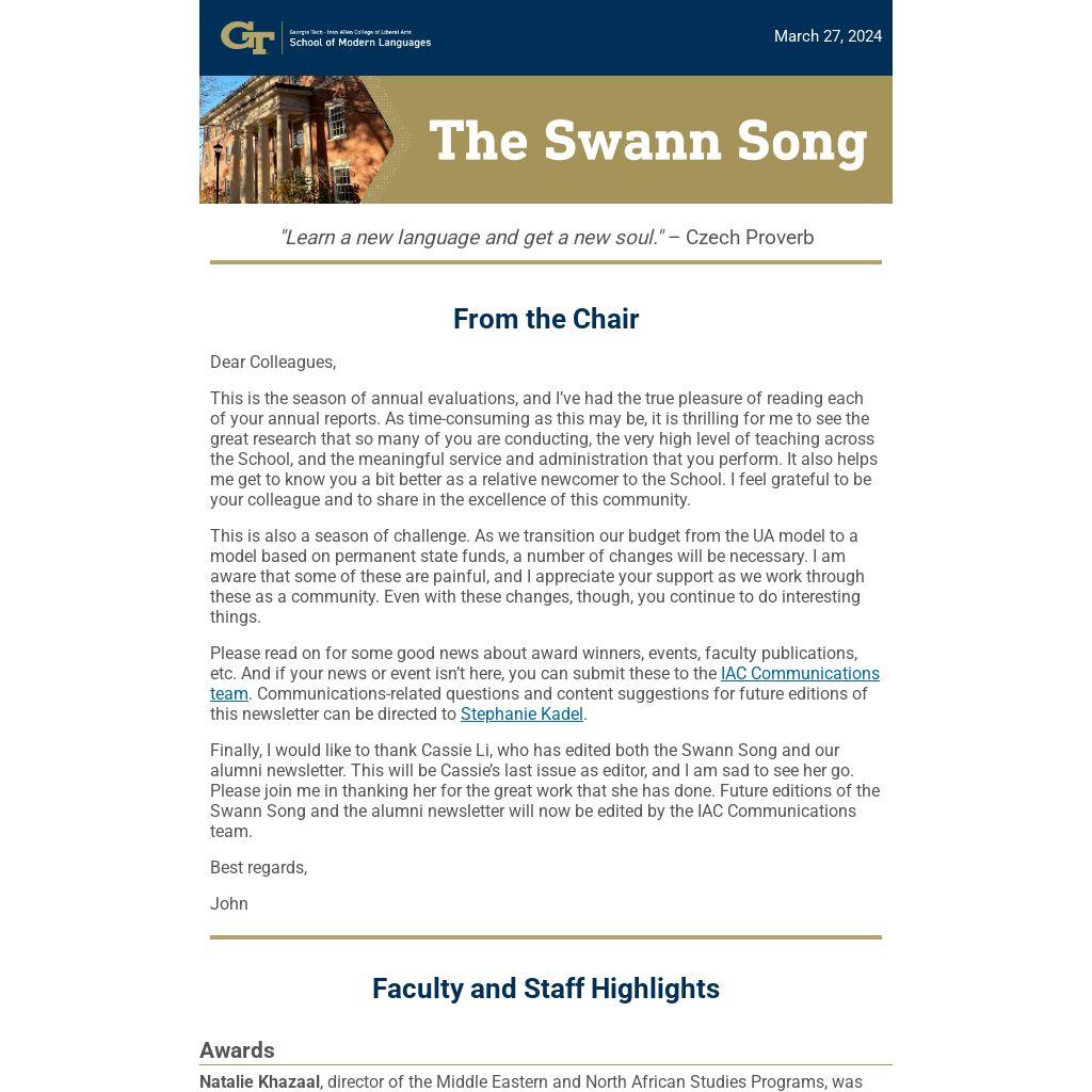 In addition, please remember that the next “Conversations With the Chair,” will take place tomorrow, Thursday, March 28, from 11a.m. to noon in Swann 123. No appointment or preparation is necessary and you don’t need to attend the entire scheduled hour. I am simply grateful for the opportunity to get your feedback about current concerns and successes and also to answer any questions you might have about current matters affecting the School.