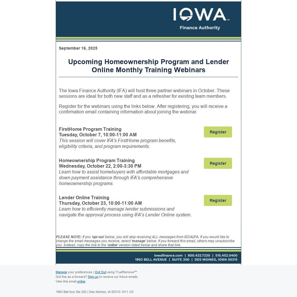 The Iowa Finance Authority (IFA) will host three partner webinars in October. These sessions are ideal for both new staff and as a refresher for existing team members.