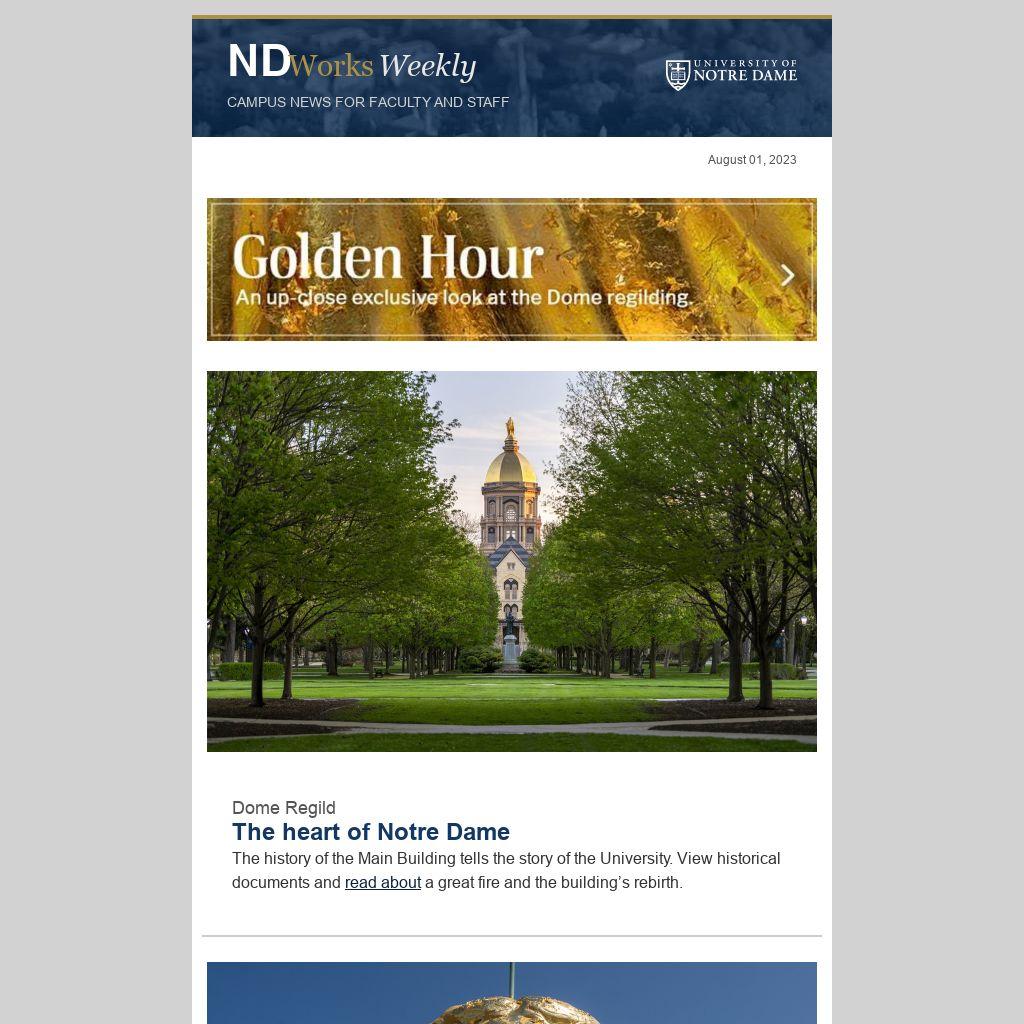 Gilding is an age-old technique in which a very thin sheet of gold, or other metal leaf, is applied to a surface. Measuring a mere 3 microns in thickness, the gold leaf is finer than a single strand of hair. Read how gilders prep and gild the 17-foot statue of Our Lady atop the Golden Dome.