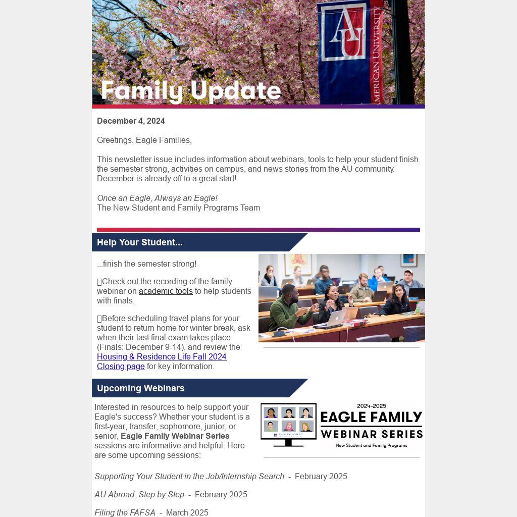 This newsletter issue includes information about webinars, tools to help your student finish the semester strong, activities on campus, and news stories from the AU community. December is already off to a great start!