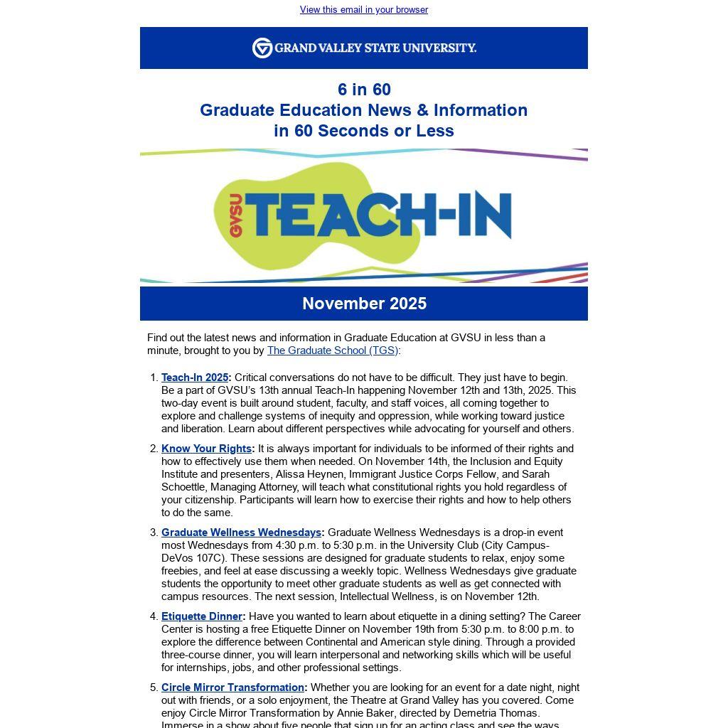 Find out the latest news and information in Graduate Education at GVSU in less than a minute, brought to you by The Graduate School (TGS):