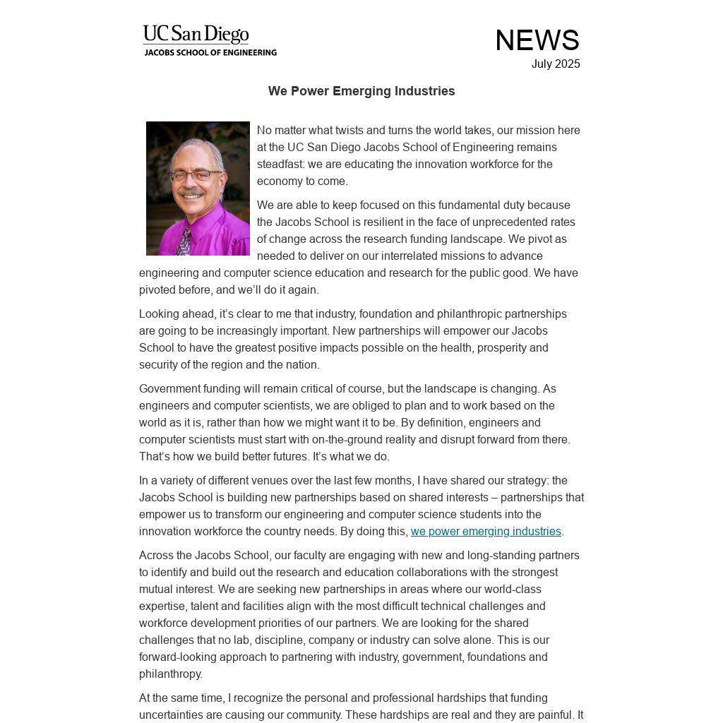 We are able to keep focused on this fundamental duty because the Jacobs School is resilient in the face of unprecedented rates of change across the research funding landscape. We pivot as needed to deliver on our interrelated missions to advance engineering and computer science education and research for the public good. We have pivoted before, and we’ll do it again.