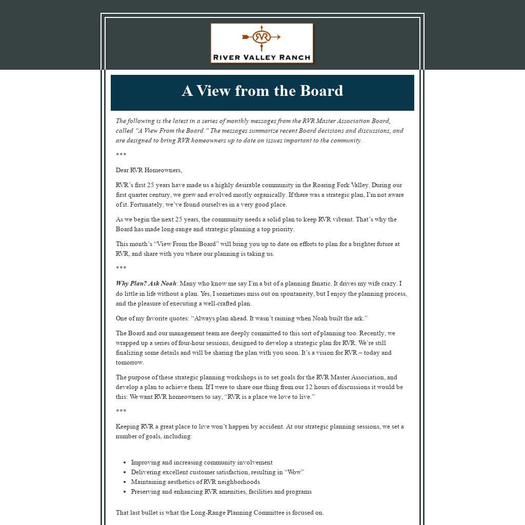 Finally, this planning effort will be the key topic of our communications with you over the next year, as planning is priority one for the Board. We look forward to engaging with you, and making sure you call RVR “A place you love to live.”