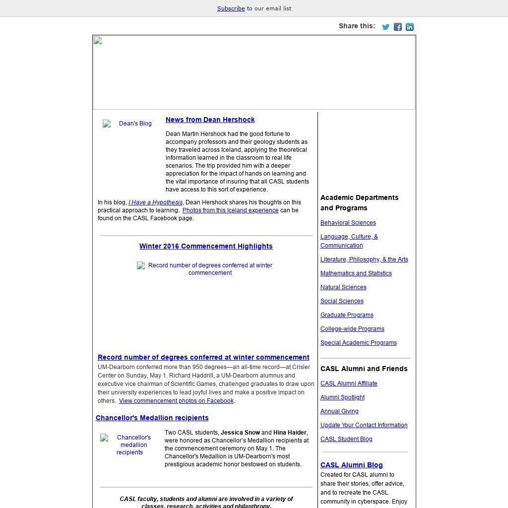 Created for CASL alumni to share their stories, offer advice, and to recreate the CASL community in cyberspace. Enjoy the entry, "UM-Dearborn: The Road Best Traveled" by Kim LaFreniere, '79.