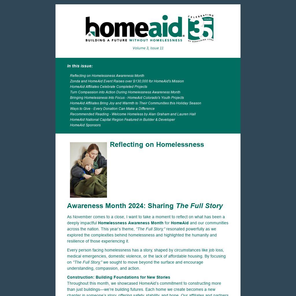 As November comes to a close, I want to take a moment to reflect on what has been a deeply impactful Homelessness Awareness Month for HomeAid and our communities across the nation. This year’s theme, “The Full Story,” resonated powerfully as we explored the complexities behind homelessness and highlighted the humanity and resilience of those experiencing it.