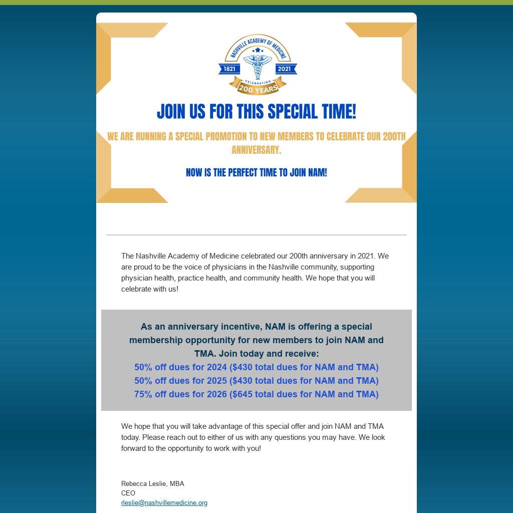The Nashville Academy of Medicine celebrated our 200th anniversary in 2021. We are proud to be the voice of physicians in the Nashville community, supporting physician health, practice health, and community health. We hope that you will celebrate with us!