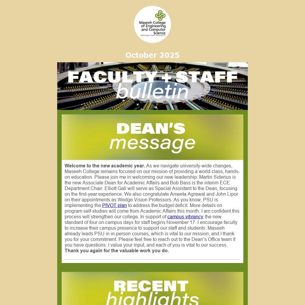 Welcome to the new academic year. As we navigate university-wide changes, Maseeh College remains focused on our mission of providing a world-class, hands-on education. Please join me in welcoming our new leadership: Martin Siderius is the new Associate Dean for Academic Affairs and Bob Bass is the interim ECE Department Chair. Elliott Gall will serve as Special Assistant to the Dean, focusing on the first-year experience. We also congratulate Ameeta Agrawal and John Lipor on their appointments as Wedge Vision Professors. As you know, PSU is implementing the PIVOT plan to address the budget deficit. More details on program self-studies will come from Academic Affairs this month. I am confident this process will strengthen our college. In support of campus vibrancy, the new standard of four on-campus days for staff begins November 17. I encourage faculty to increase their campus presence to support our staff and students. Maseeh already leads PSU in in-person courses, which is vital to our mission, and I thank you for your commitment. Please feel free to reach out to the Dean’s Office team if you have questions. I value your input, and each of you is vital to our success. Thank you again for the valuable work you do.