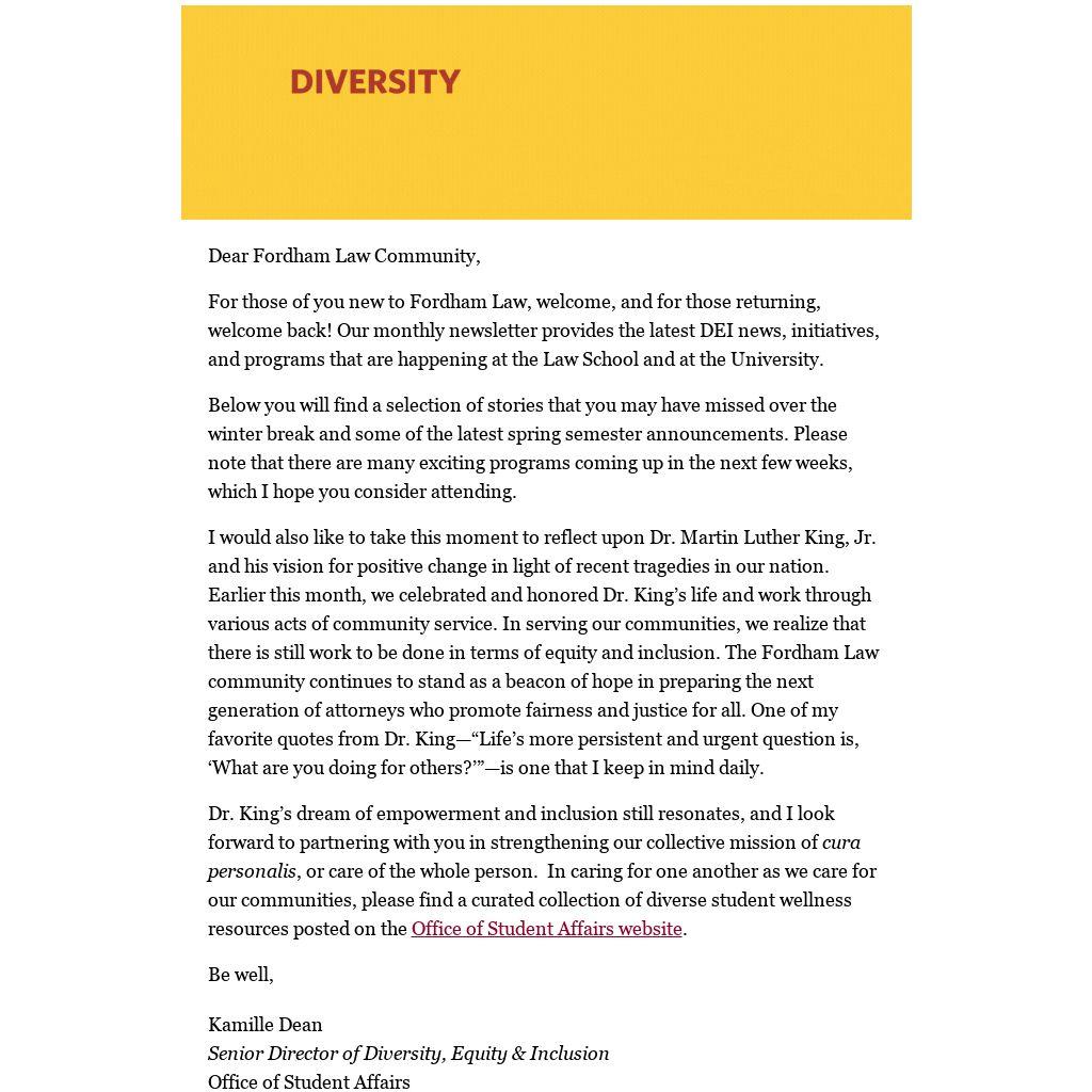 For those of you new to Fordham Law, welcome, and for those returning, welcome back! Our monthly newsletter provides the latest DEI news, initiatives, and programs that are happening at the Law School and at the University.