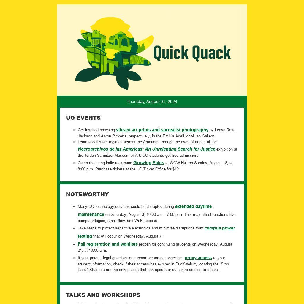 Many UO technology services could be disrupted during extended daytime maintenance on Saturday, August 3, 10:00 a.m.–7:00 p.m. This may affect functions like computer logins, email flow, and Wi-Fi access.