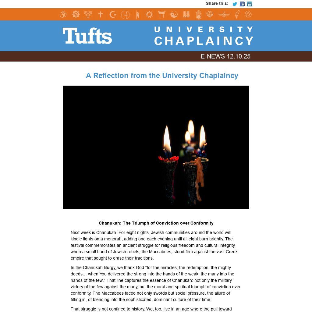 The University Chaplaincy is a dynamic hub supporting religious, spiritual, ethical, and cultural life for all members of the Tufts community. We provide spiritual care, support religious and philosophical communities, educate about spiritual and ethical issues in society and the world, and promote multifaith engagement.