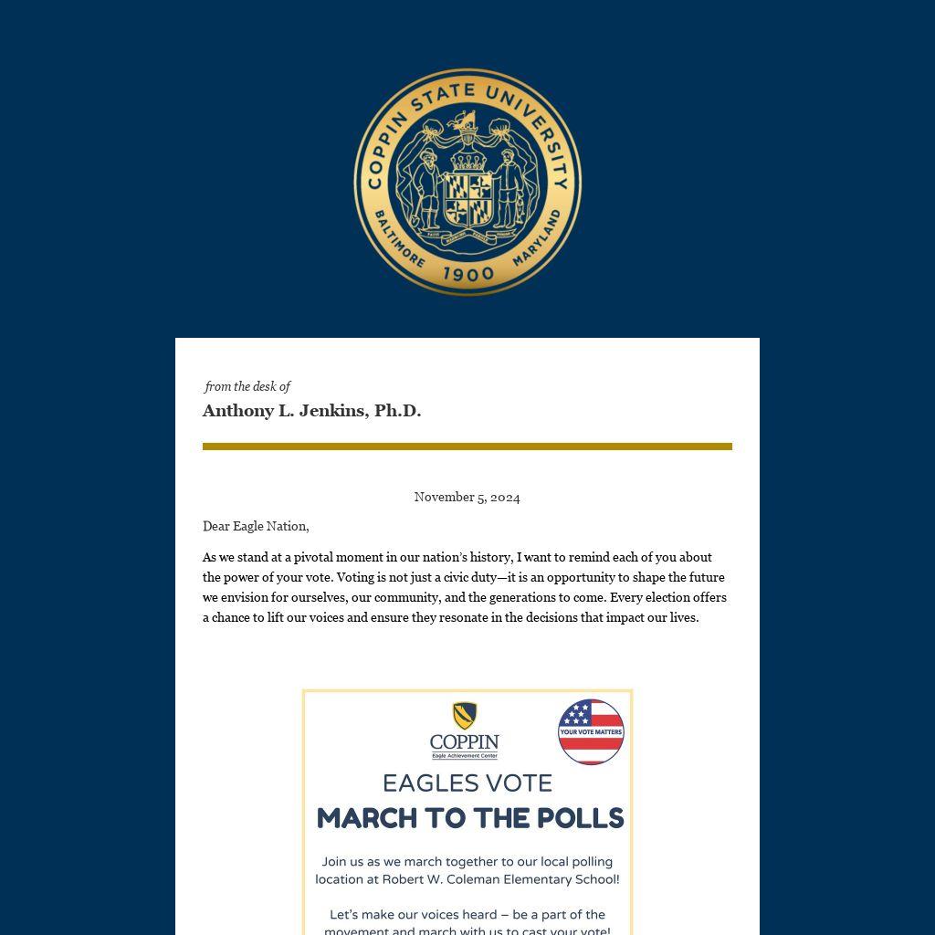 Let us continue to uphold the legacy of resilience, leadership, and empowerment that defines Coppin. Make your voice heard—go vote. EAGLES VOTE!