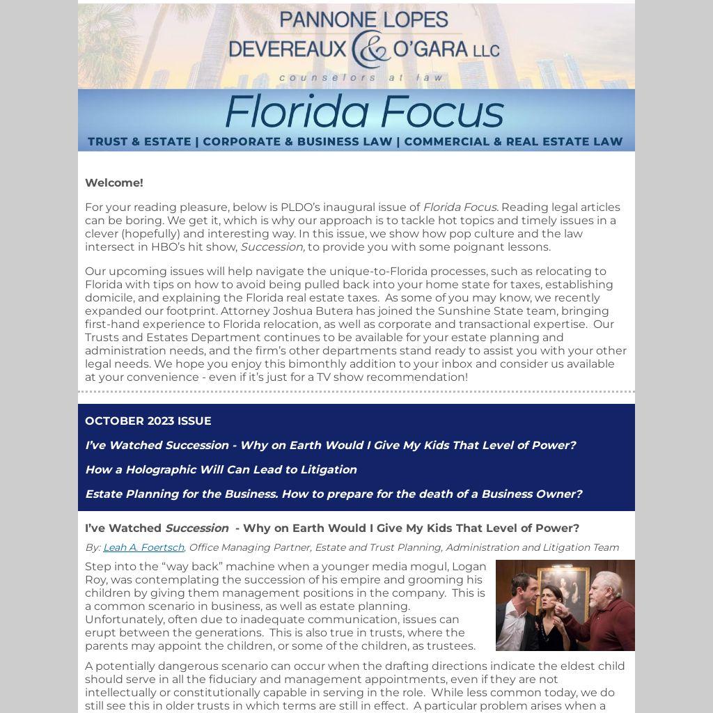 For your reading pleasure, below is PLDO’s inaugural issue of Florida Focus. Reading legal articles can be boring. We get it, which is why our approach is to tackle hot topics and timely issues in a clever (hopefully) and interesting way. In this issue, we show how pop culture and the law intersect in HBO’s hit show, Succession, to provide you with some poignant lessons.