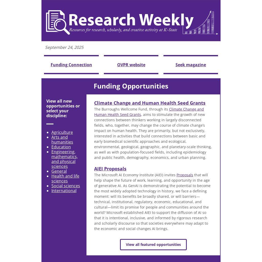 The Kansas State University, Office of Research Development’s Faculty Development Award (FDA) and University Small Grant (USRG) programs provide international meeting travel support and seed grant funding to K-State faculty. The FDA award can also be used to meet with program officers from potential external funders. Awards for the FDA program typically range from $1,000 to $3,500. For USRG awards, the range is $2,000 to $5,000. The proposals for both programs are due by 5 pm on October 1, 2025 and should be submitted via ord@ksu.edu.