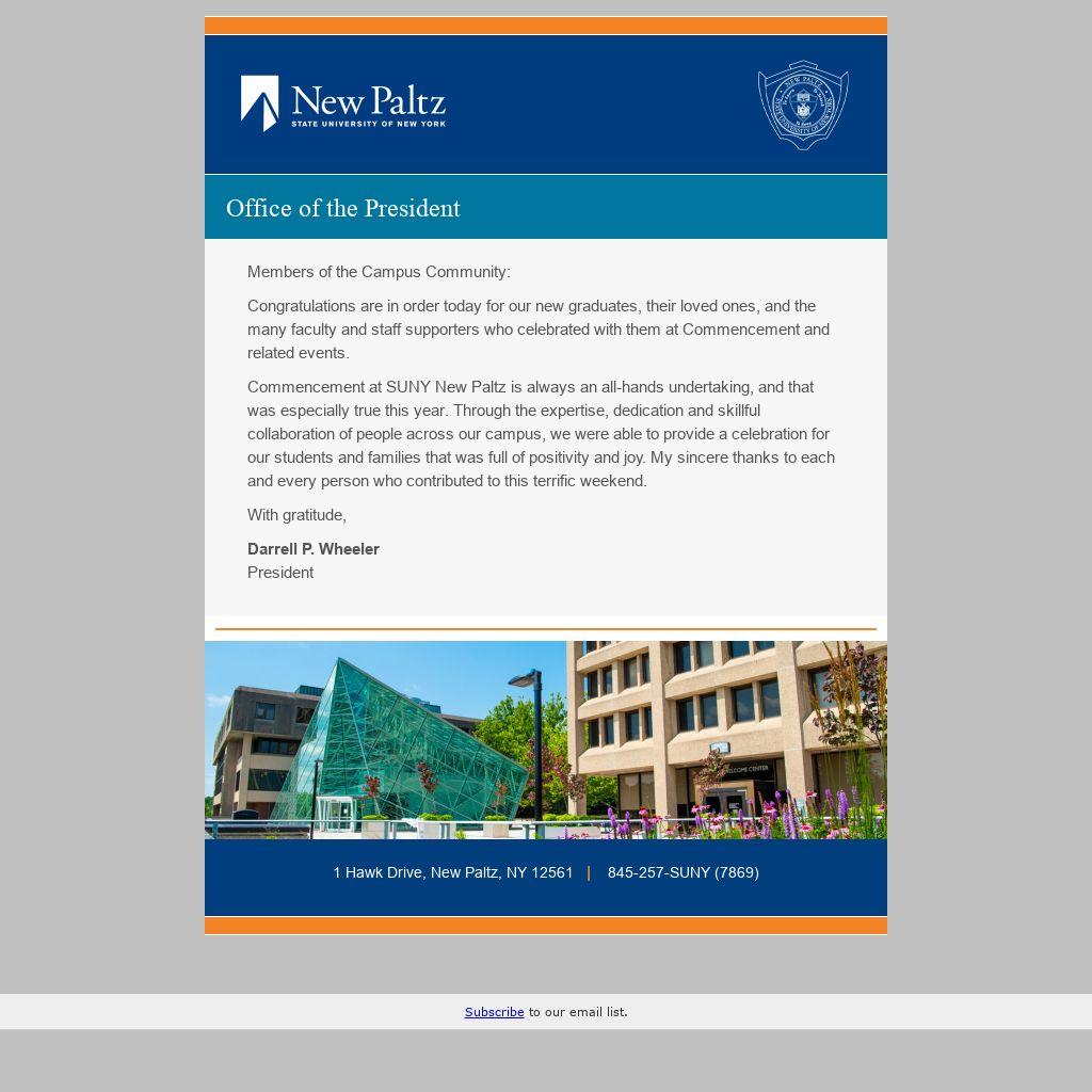 Commencement at SUNY New Paltz is always an all-hands undertaking, and that was especially true this year. Through the expertise, dedication and skillful collaboration of people across our campus, we were able to provide a celebration for our students and families that was full of positivity and joy. My sincere thanks to each and every person who contributed to this terrific weekend.