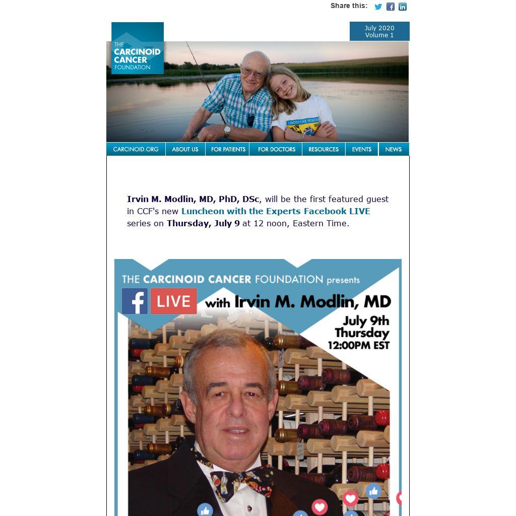 Irvin M. Modlin, MD, PhD, DSc, will be the first featured guest in CCF's new Luncheon with the Experts Facebook LIVE series on Thursday, July 9 at 12 noon, Eastern Time.
