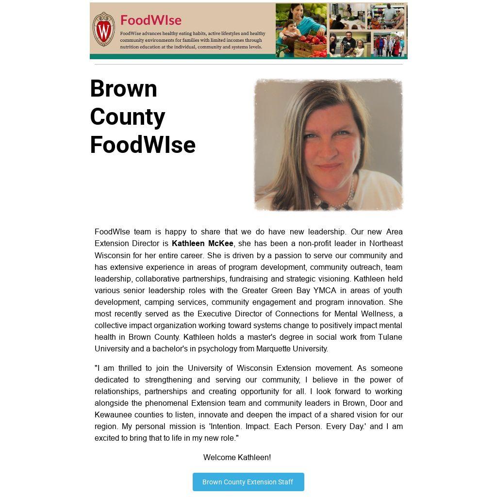 FoodWIse team is happy to share that we do have new leadership. Our new Area Extension Director is Kathleen McKee, she has been a non-profit leader in Northeast Wisconsin for her entire career. She is driven by a passion to serve our community and has extensive experience in areas of program development, community outreach, team leadership, collaborative partnerships, fundraising and strategic visioning. Kathleen held various senior leadership roles with the Greater Green Bay YMCA in areas of youth development, camping services, community engagement and program innovation. She most recently served as the Executive Director of Connections for Mental Wellness, a collective impact organization working toward systems change to positively impact mental health in Brown County. Kathleen holds a master's degree in social work from Tulane University and a bachelor's in psychology from Marquette University.