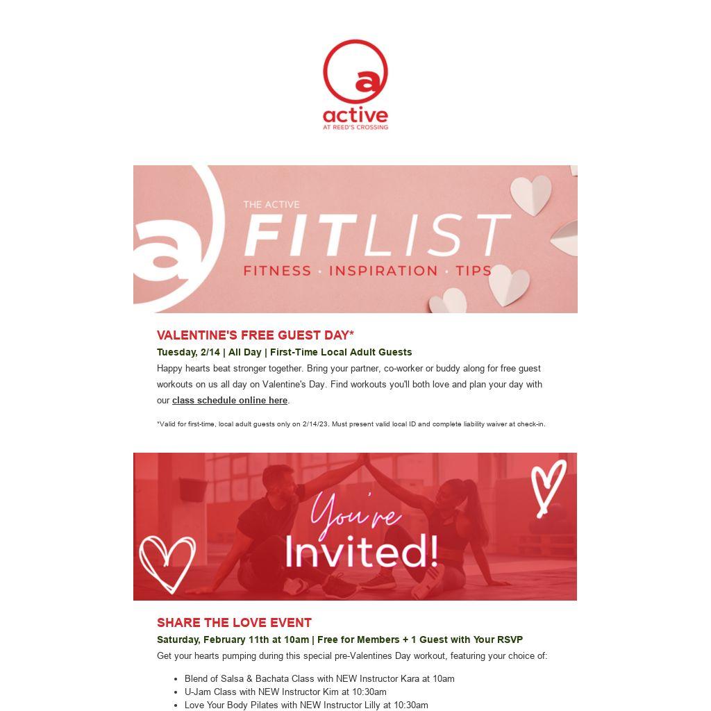 Tuesday, 2/14 | All Day | First-Time Local Adult GuestsHappy hearts beat stronger together. Bring your partner, co-worker or buddy along for free guest workouts on us all day on Valentine's Day. Find workouts you'll both love and plan your day with our class schedule online here.
