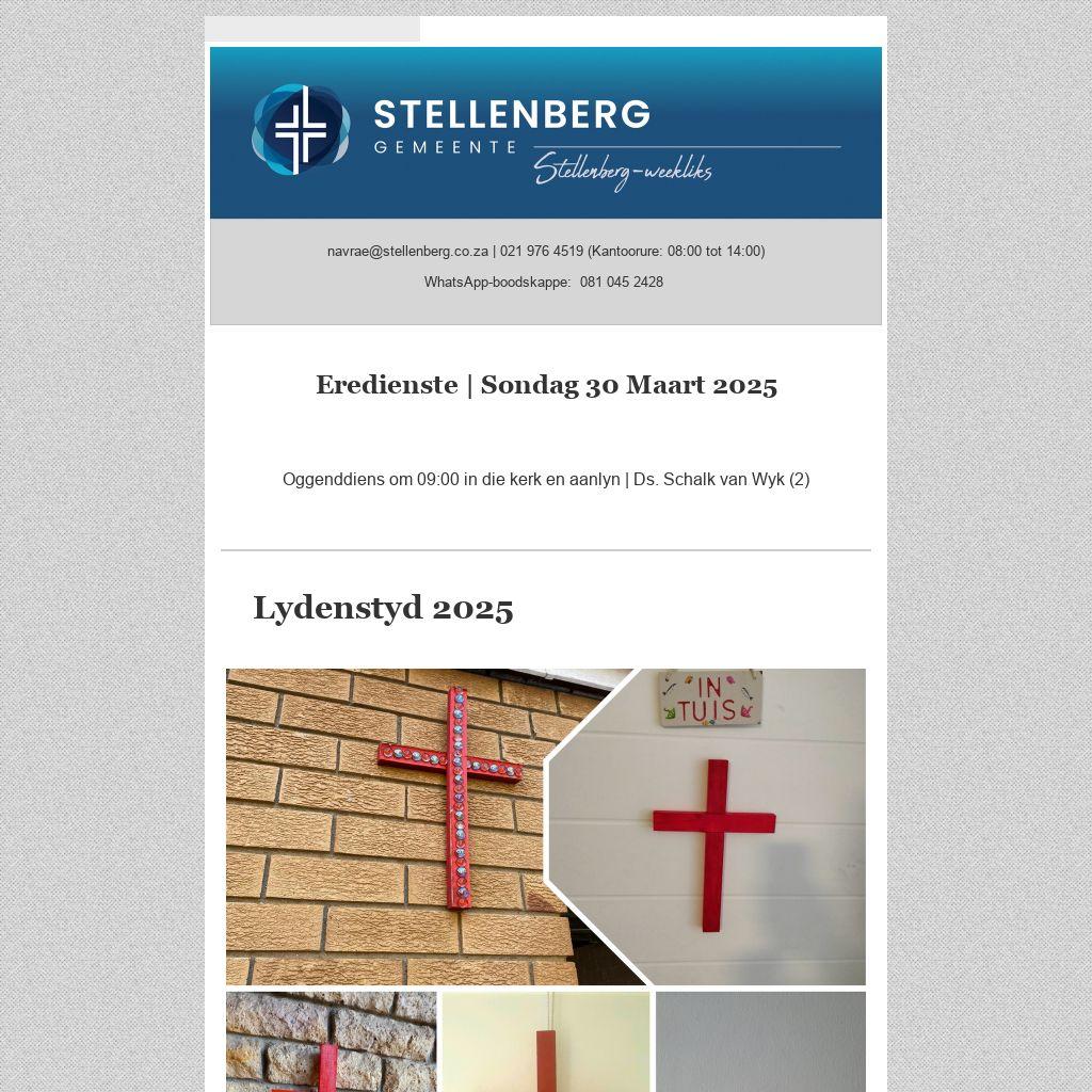 Plaas gerus ’n advertensie in die Stellenberg-weekliks. Die nuusblad word tans weekliks elektronies aan 2 500 persone gestuur en is ook op die gemeente se webwerf beskikbaar. Advertensies sal slegs aanlyn beskikbaar wees en word nie in gedrukte formaat uitgegee nie. Lees meer . . .