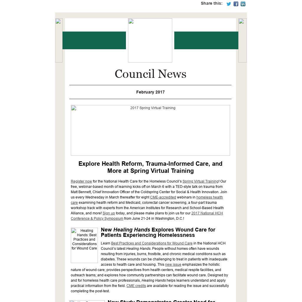 | Register now for the National Health Care for the Homeless Council’s Spring Virtual Training! Our free, webinar-based month of learning kicks off on March 6 with a TED-style talk on trauma from Matt Bennett, Chief Innovation Officer of the Coldspring Center for Social & Health Innovation. Join us every Wednesday in March thereafter for eight CME-accredited webinars in homeless health care examining health reform and Medicaid, colorectal cancer screening, a four-part trauma workshop track with experts from the American Institutes for Research and School-Based Health Alliance, and more! Sign up today, and please make plans to join us for our 2017 National HCH Conference & Policy Symposium from June 21-24 in Washington, D.C.!