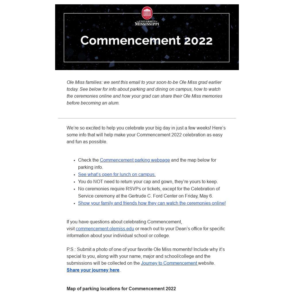 Ole Miss families: we sent this email to your soon-to-be Ole Miss grad earlier today. See below for info about parking and dining on campus, how to watch the ceremonies online and how your grad can share their Ole Miss memories before becoming an alum.