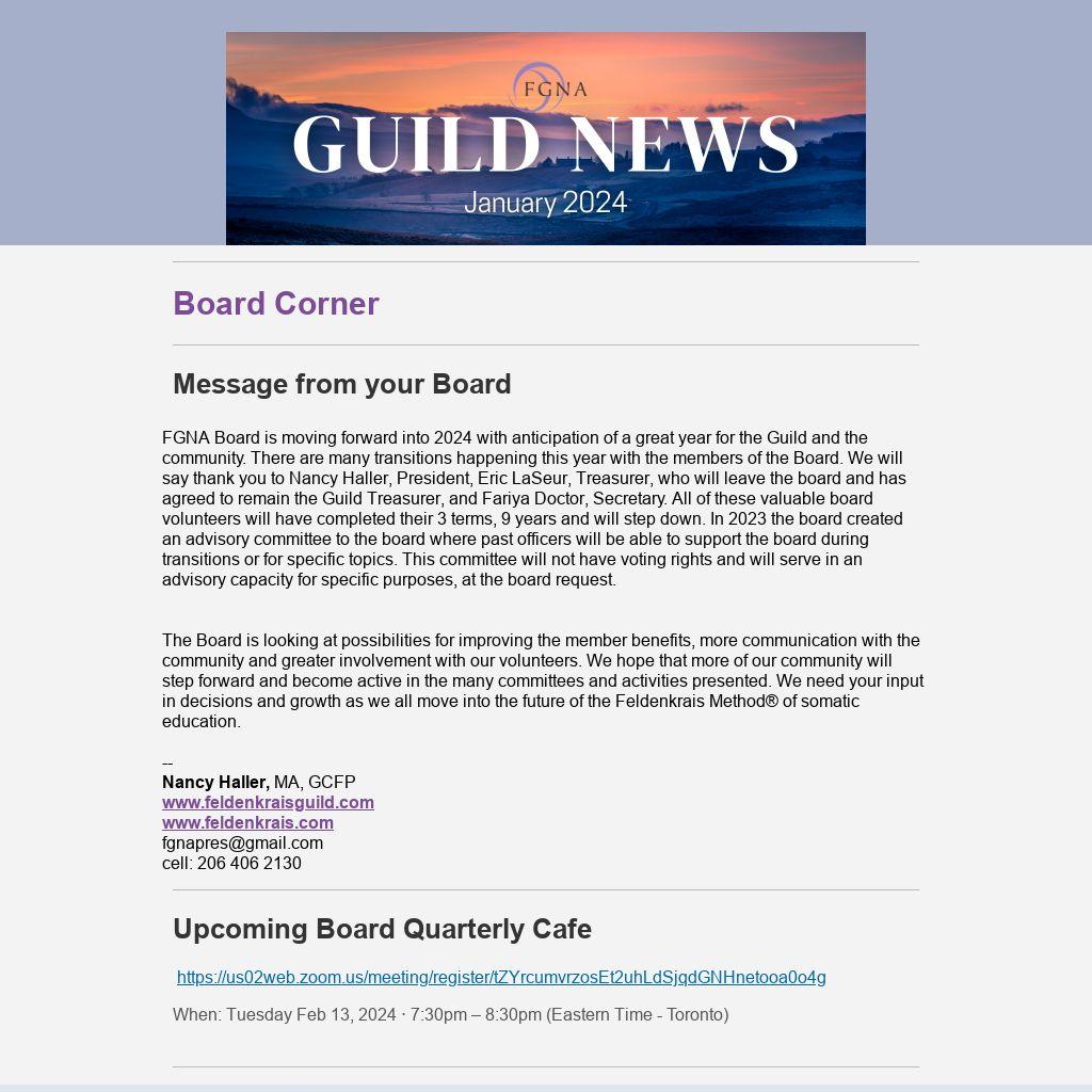 FGNA Board is moving forward into 2024 with anticipation of a great year for the Guild and the community. There are many transitions happening this year with the members of the Board. We will say thank you to Nancy Haller, President, Eric LaSeur, Treasurer, who will leave the board and has agreed to remain the Guild Treasurer, and Fariya Doctor, Secretary. All of these valuable board volunteers will have completed their 3 terms, 9 years and will step down. In 2023 the board created an advisory committee to the board where past officers will be able to support the board during transitions or for specific topics. This committee will not have voting rights and will serve in an advisory capacity for specific purposes, at the board request.