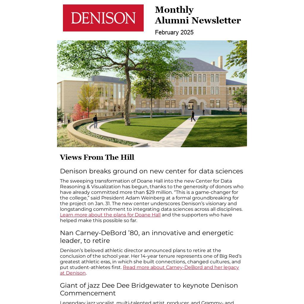 The sweeping transformation of Doane Hall into the new Center for Data Reasoning & Visualization has begun, thanks to the generosity of donors who have already committed more than $29 million. “This is a game-changer for the college,” said President Adam Weinberg at a formal groundbreaking for the project on Jan. 31. The new center underscores Denison’s visionary and longstanding commitment to integrating data sciences across all disciplines. Learn more about the plans for Doane Hall and the supporters who have helped make this possible so far.