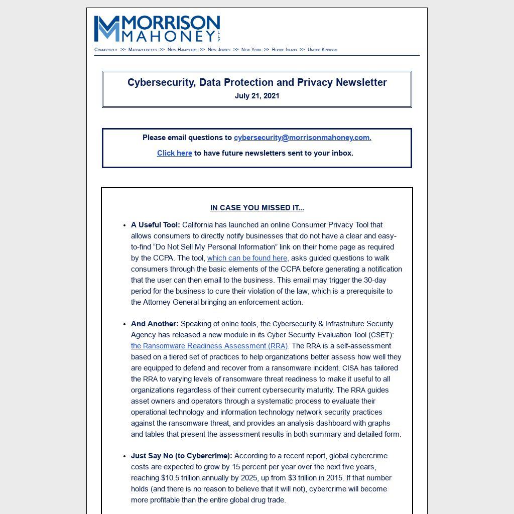 | This communication, which we believe may be of interest to our clients and friends is for general information only. It is not a full analysis of the matters presented and should not be relied upon as legal advice. If you have received this email in error, please notify the sender immediately and destroy the original message, any attachments, and all copies. This may be considered attorney advertising in some jurisdictions. If you have any questions about the items above or Morrison Mahoney's Cybersecurity, Data and Privacy Protection practice, please feel free to contact Daniel Marvin at dmarvin@morrisonmahoney.com. With 180 attorneys and 10 offices throughout the Northeast, Morrison Mahoney LLP is one of the leading business and litigation firms in the region. We provide a wide array of legal services covering cybersecurity, litigation, transactional, appellate and insurance coverage practice areas. For more information about the firm, visit our web site at: www.morrisonmahoney.com.