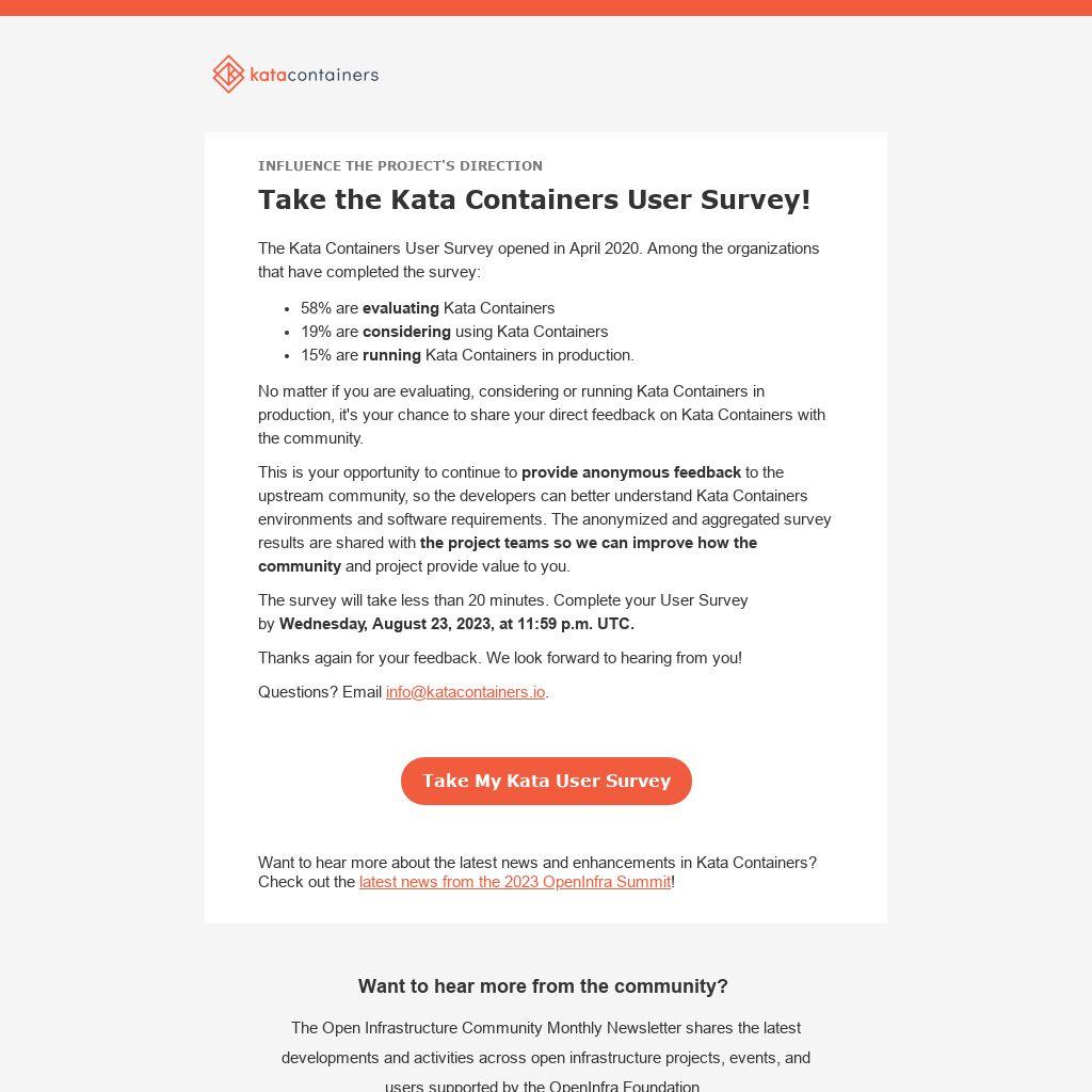 This is your opportunity to continue to provide anonymous feedback to the upstream community, so the developers can better understand Kata Containers environments and software requirements. The anonymized and aggregated survey results are shared with the project teams so we can improve how the community and project provide value to you.