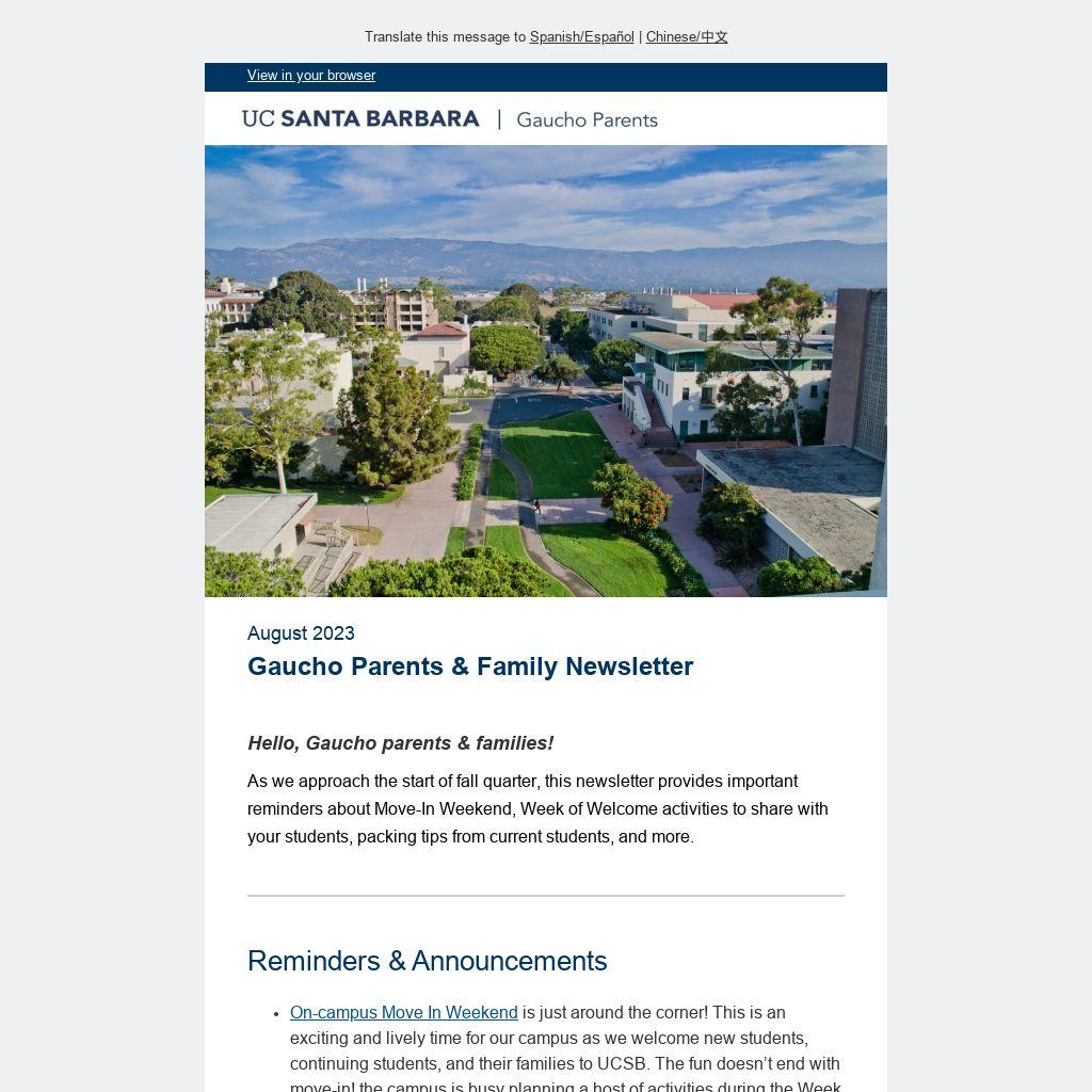 As we approach the start of fall quarter, this newsletter provides important reminders about Move-In Weekend, Week of Welcome activities to share with your students, packing tips from current students, and more.