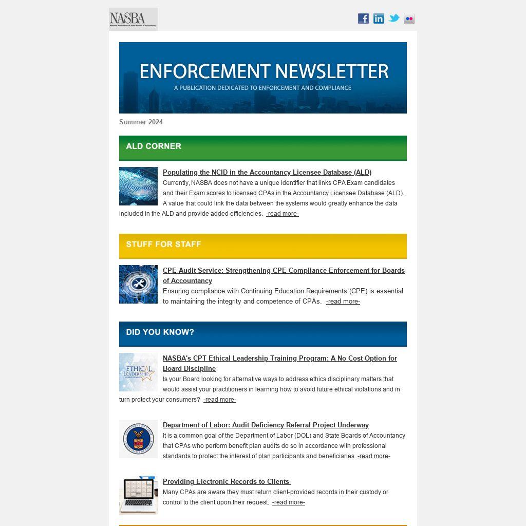 Enforcement Legislative Update The 2024 legislative sessions came to an end for most states with the start of summer. While NASBA tracked many bills on enforcement matters, most bills from this year’s legislative sessions under the enforcement category focused on how criminal histories are weighed in licensure application decisions. -read more-