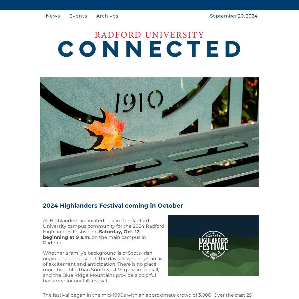 All Highlanders are invited to join the Radford University campus community for the 2024 Radford Highlanders Festival on Saturday, Oct. 12, beginning at 9 a.m. on the main campus in Radford.