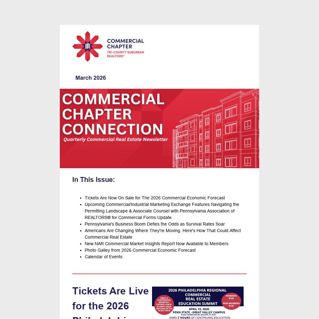 Tri-County Suburban REALTORS®’ Commercial Chapter will host its next Commercial/Industrial Marketing Exchange on April 10th in a hybrid format, in-person at our Malvern office, with a virtual option available via Zoom. This working session is designed to connect commercial real estate professionals, create opportunity, and keep members informed on key industry updates.