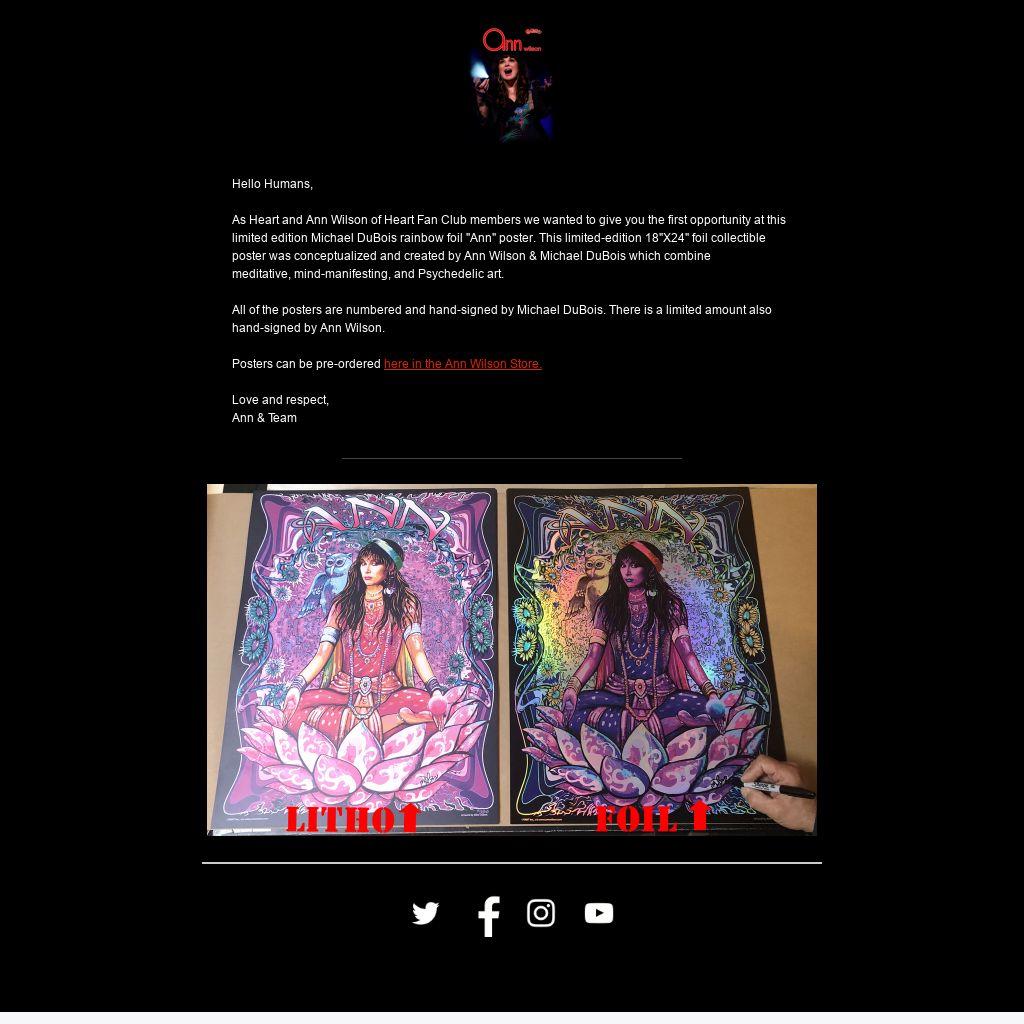 As Heart and Ann Wilson of Heart Fan Club members we wanted to give you the first opportunity at this limited edition Michael DuBois rainbow foil "Ann" poster. This limited-edition 18"X24" foil collectible poster was conceptualized and created by Ann Wilson & Michael DuBois which combine meditative, mind-manifesting, and Psychedelic art.