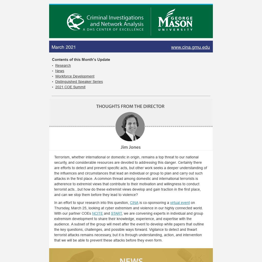 In an effort to spur research into this question, CINA is co-sponsoring a virtual event on Thursday, March 25, looking at cyber extremism and violence in our highly connected world. With our partner COEs NCITE and START, we are convening experts in individual and group extremism development to share their knowledge, experience, and expertise with the audience. A subset of the group will meet after the event to develop white papers that outline the key questions, challenges, and possible ways forward. Vigilance to detect and thwart terrorist attacks remains necessary, but it is through understanding, action, and intervention that we will be able to prevent these attacks before they even form.