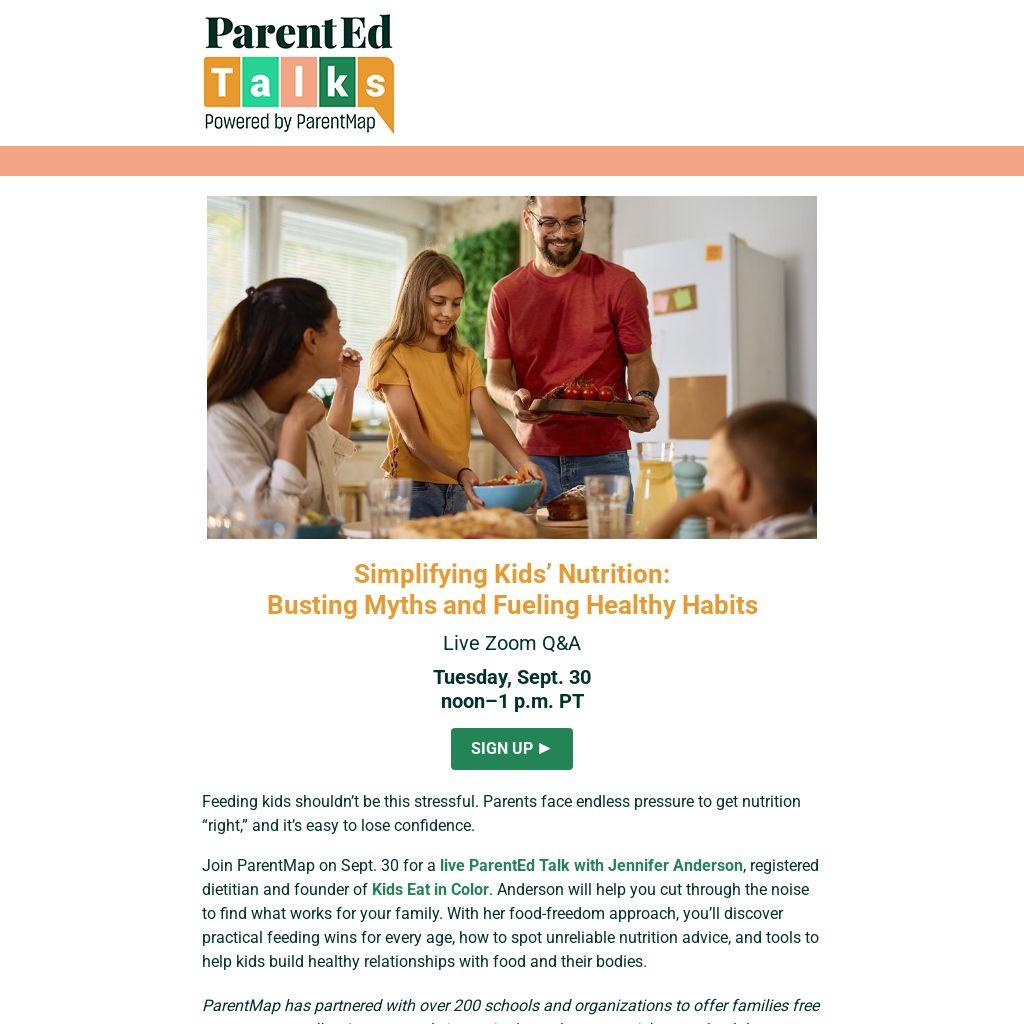 Join ParentMap on Sept. 30 for a live ParentEd Talk with Jennifer Anderson, registered dietitian and founder of Kids Eat in Color. Anderson will help you cut through the noise to find what works for your family. With her food-freedom approach, you’ll discover practical feeding wins for every age, how to spot unreliable nutrition advice, and tools to help kids build healthy relationships with food and their bodies.