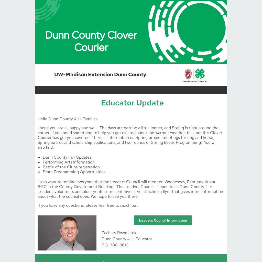 I also want to remind everyone that the Leaders Council will meet on Wednesday, February 4th at 6:30 in the County Government Building. The Leaders Council is open to all Dunn County 4-H Leaders, volunteers and older youth representatives. I've attached a flyer that gives more information about what the council does. We hope to see you there!