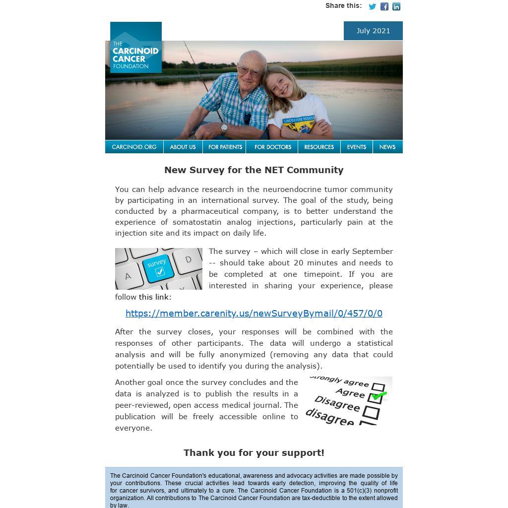 You can help advance research in the neuroendocrine tumor community by participating in an international survey. The goal of the study, being conducted by a pharmaceutical company, is to better understand the experience of somatostatin analog injections, particularly pain at the injection site and its impact on daily life.