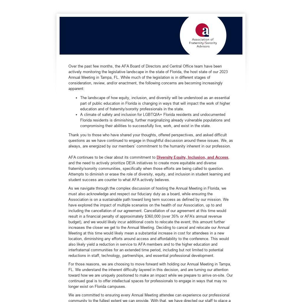 As we navigate through the complex discussion of hosting the Annual Meeting in Florida, we must also acknowledge and respect our fiduciary duty as a board, while ensuring the Association is on a sustainable path toward long term success as defined by our mission. We have explored the impact of multiple scenarios on the health of our Association, up to and including the cancellation of our agreement. Cancellation of our agreement at this time would result in a financial penalty of approximately $360,000 (over 35% or AFA’s annual revenue budget), and we would likely incur additional costs to relocate the event; this amount further increases the closer we get to the Annual Meeting. Deciding to cancel and relocate our Annual Meeting at this time would likely mean a substantial increase in cost for attendees in a new location, diminishing any efforts around access and affordability to the conference. This would also likely yield a reduction in service to AFA members and to the higher education and interfraternal communities for an extended time period, including but not limited to potential reductions in staff, technology, partnerships, and essential professional development.