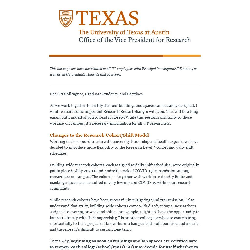 This message has been distributed to all UT employees with Principal Investigator (PI) status, as well as all UT graduate students and postdocs.