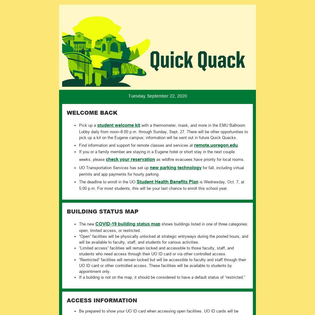 Pick up a student welcome kit with a thermometer, mask, and more in the EMU Ballroom Lobby daily from noon–8:00 p.m. through Sunday, Sept. 27. There will be other opportunities to pick up a kit on the Eugene campus; information will be sent out in future Quick Quacks.