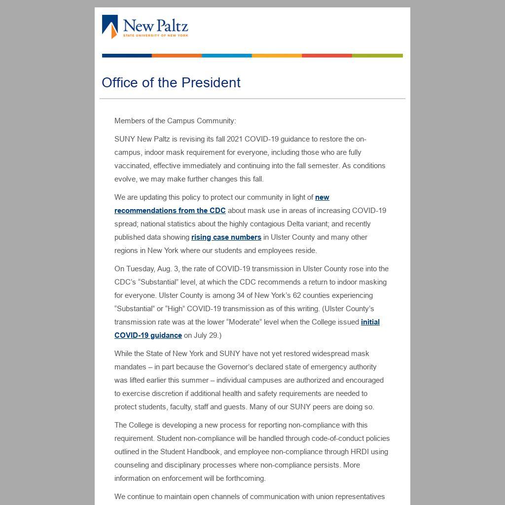 SUNY New Paltz is revising its fall 2021 COVID-19 guidance to restore the on-campus, indoor mask requirement for everyone, including those who are fully vaccinated, effective immediately and continuing into the fall semester. As conditions evolve, we may make further changes this fall.