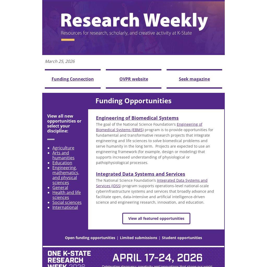 For further information on funding opportunities, limited submissions, teaming, and submission and writing strategies, contact the Office of Research Development team via ord@ksu.edu.