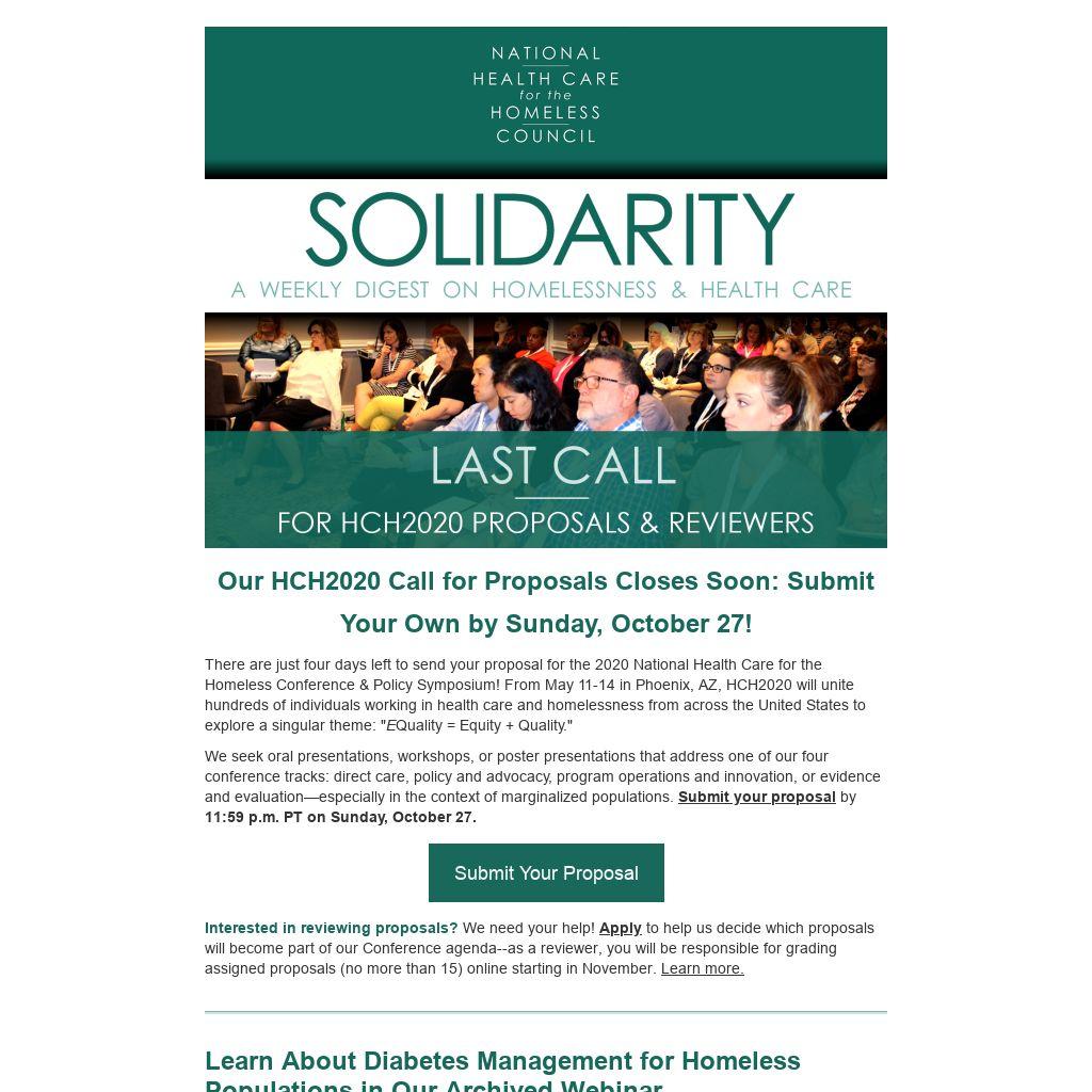 There are just four days left to send your proposal for the 2020 National Health Care for the Homeless Conference & Policy Symposium! From May 11-14 in Phoenix, AZ, HCH2020 will unite hundreds of individuals working in health care and homelessness from across the United States to explore a singular theme: "EQuality = Equity + Quality."
