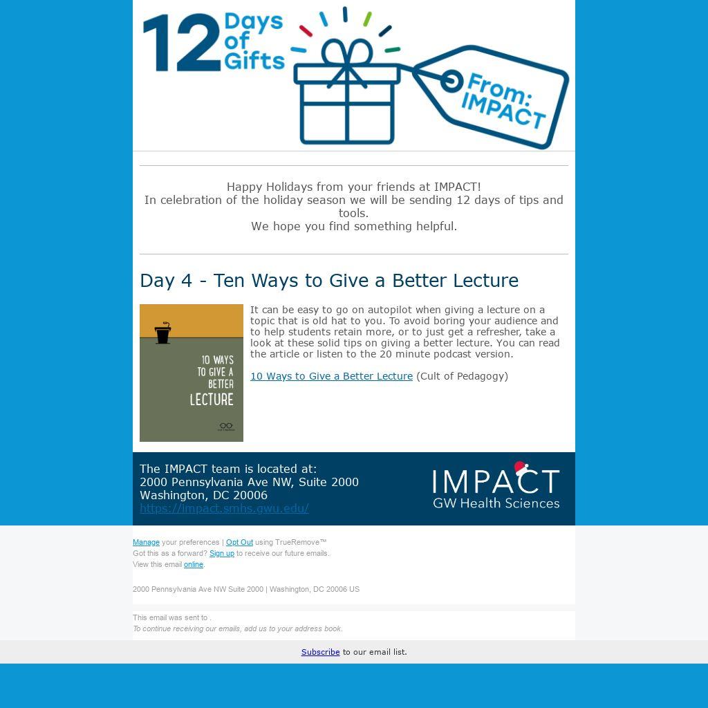It can be easy to go on autopilot when giving a lecture on a topic that is old hat to you. To avoid boring your audience and to help students retain more, or to just get a refresher, take a look at these solid tips on giving a better lecture. You can read the article or listen to the 20 minute podcast version.