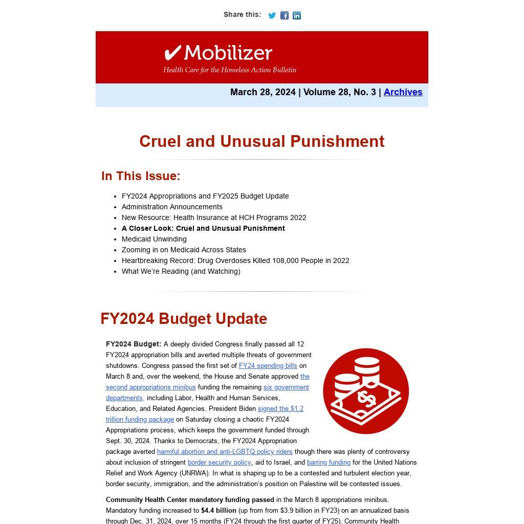 FY2025 budget: The President outlined his priorities in his State of the Union address on March 7 and released his FY2025 Budget on March 11. President Biden’s Unity Agenda for the Nation fact sheet lays out President Biden’s priorities including fighting opioid addiction, tackling the youth mental health crisis, maternity care deserts, and gaps in access to primary care. His budget calls for expanding community health centers, and specifically increasing funding to HCH programs to increase street medicine and street outreach activities.